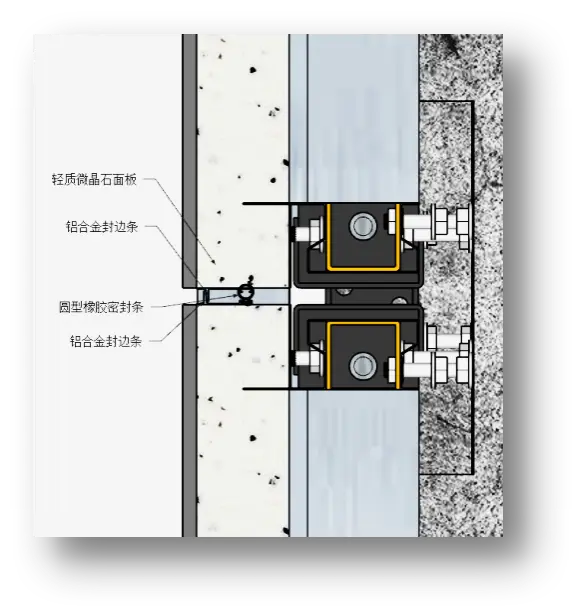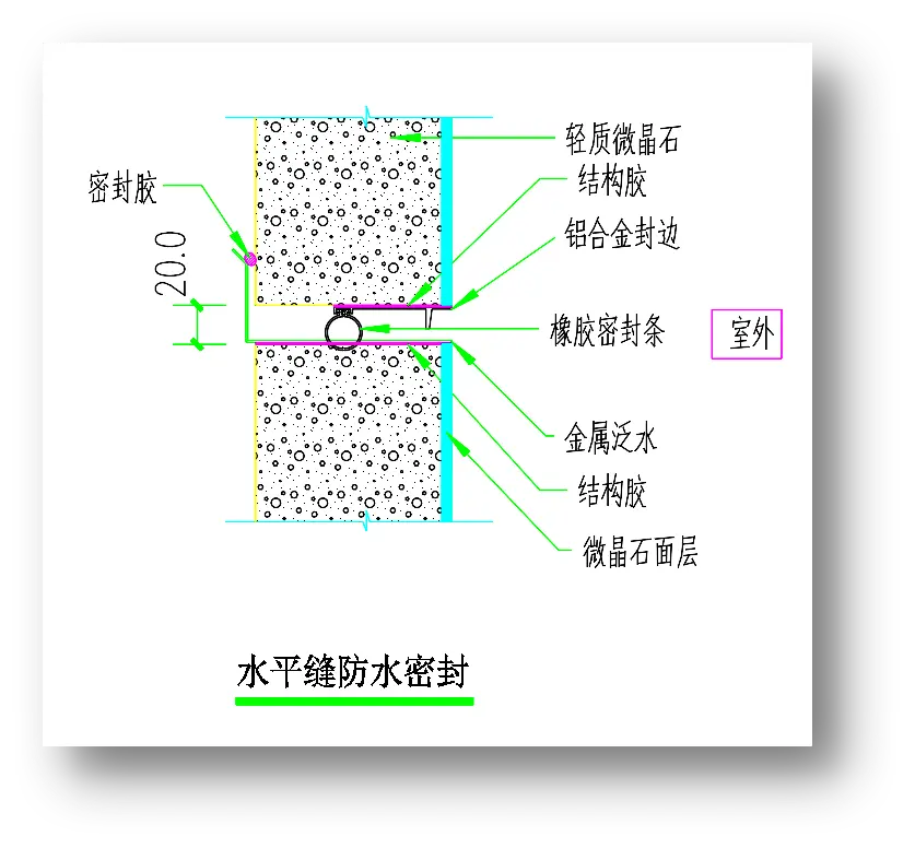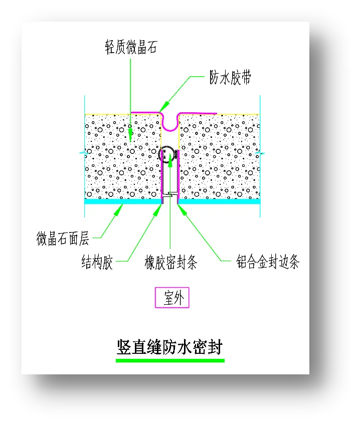 轻晶石单元墙体接缝采用注浆密封,墙体之间接缝采用雨幕原理及疏堵结合以疏为主防水构造。